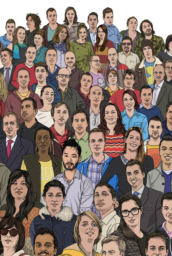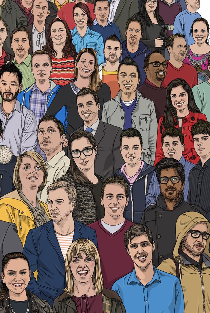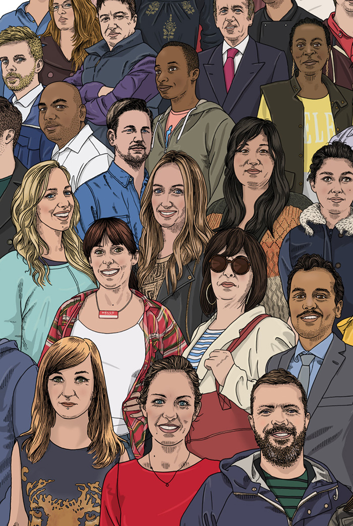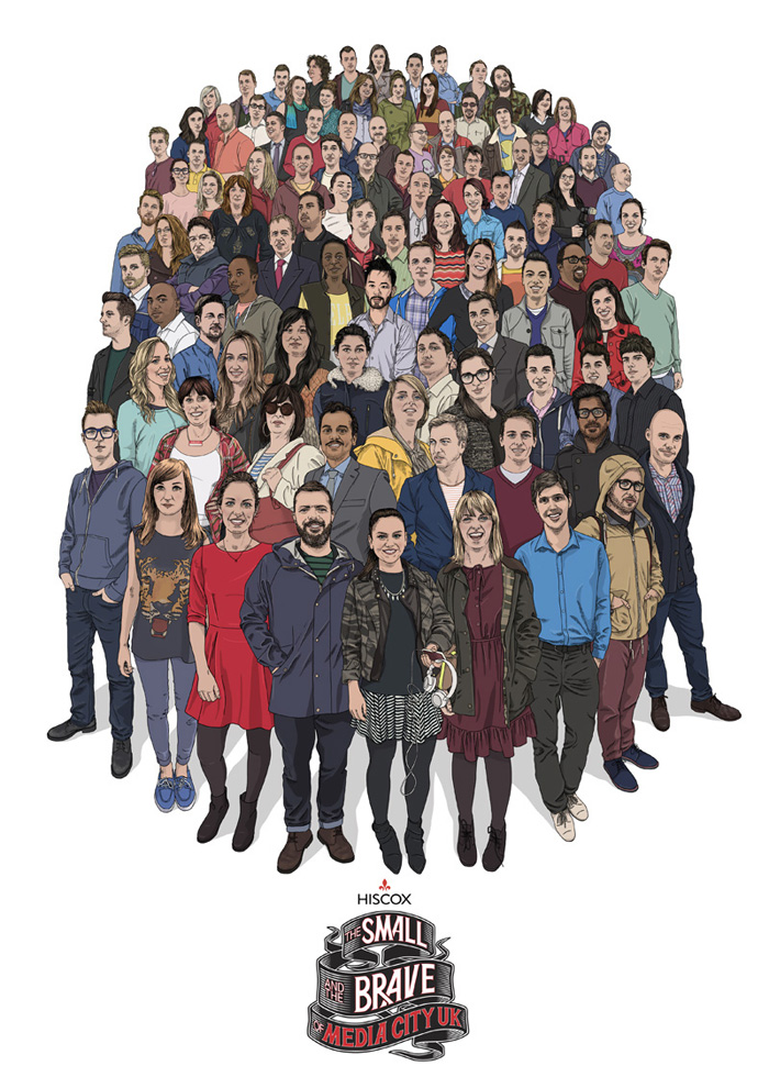 A large portrait commission for Hiscox celebrating the many small businesses based here in Media City UK in Salford, Greater Manchester. I also created the custom type lock-up for the event, which involved a makeshift studio built from a shipping crate located in the plaza at Media City. People could come to studio, get photographed and have a chat, while I set about sketching out some roughs for the final portrait. After the event I went back to my studio at home and built up the final piece over the next few weeks. This was a fantastic project to work on, easily one of the most exciting jobs I've had. I have to say a big 'thankyou' to the team at VCCP who organised everything too, they were awesome.