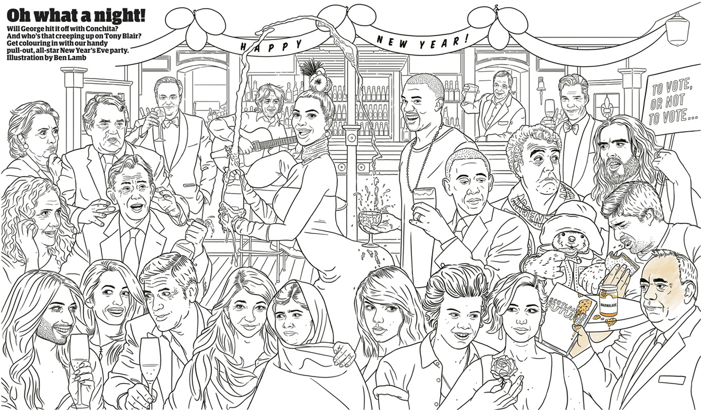 Centre spread in the end of year Guardian Weekend magazine. A special colouring-in activity page for adults featuring a cast of heroes and villains who made the news in 2014. Someone helpfully wrote in to the letters page a few weeks later pointing out that Bob Geldof actually plays left handed… you live and learn.